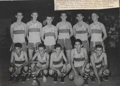 Foto dos anos 60, de uma equipe de basquete formadas por jovens , que jogavam na quadra da Associação atlética Ituveravense, que era instalada onde é hoje a piscina do clube. (1) Alceu Flores Pimenta, (2) Élcio Vilela (“Ventania”), (3) Eduardo Medina Bucker (“Duda”), (4) José Lúcio Teoro, (5) Rubens Abdalla Judgar (“Burdina”), (6) Homero Jaime Vilhena Leite, (7) Ari Telles Menezes, (8) Pedro Cristino Barbosa, (9) Antônio de Pádua Cruz, (10) Altair Côrrea Gomes e (11) Hermes Pinheiro