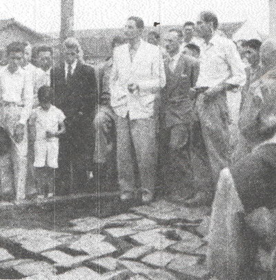 Foto de 12 de setembro de 1949, em solenidade que marcou o início do calçamento na cidade, na Rua Cel. José Nunes da Silva. Os vereadores