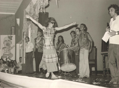 Foto de 1973, dos áureos carnavais da Associação Atlética Ituveravense. A banda, que era formada por músicos da cidade, era muito boa. (1) Calistrato de Oliveira Campos Filho, que era presidente do clube, (2) e (3) os líderes da banda, Nelson Cordaro e Luiz Augusto Lima Machado, (4) um membro do bloco carnavalesco Maria Giriza,(5) não identificado, (6) Sebastião Aparecido de Oliveira (“Tião Gallo”), (7) Etevaldo