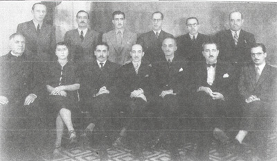 (4) Dr. Francisco Faleiros, (5) Dr. Cláudio Romeiro, (6) Joaquim Ribeiro da Rocha. Sentados: (7) padre João Rulli, (8) a professora Maria Caleiros, (9) Dr. José Alípio Furquim Fonseca, (10) Dr. Itagiba Porto, que era juiz de Direito, (11) Prof. Ademar Figueiredo, (12) o prefeito Balduino Nunes da Silva, (13) Dr. Gilberto Andrade, que era delegado de Polícia