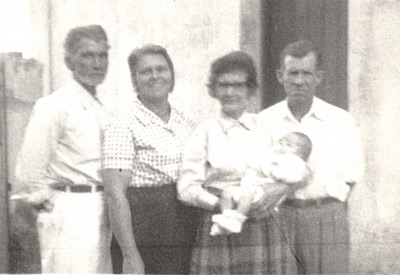 Foto 1962, do menino Hermes Procópio dos Santos Filho, com os avós paternos (1) e (2) Ariró Procópio dos Santos e Maria Barbosa, e (3) e (4) Maria Rita e Arthur Ribeiro (“Chico Querubim”). Herminho, de faleceu ainda muito jovem, é filho de Hermes Procópio dos Santos e Neiva Ribeiro Procópio dos Santos e são seus irmãos Selene Procópio dos Santos e Rômulo Procópio dos Santos