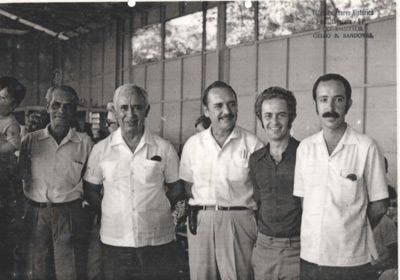 Foto de 1.969, nas dependências da empresa Camargo Corrêa, que eram instaladas na Via Anhanguera (próximas onde hoje é o pedágio). A Camargo Corrêa fazia o novo traçado da estrada de ferro desde Campinas, passando por Ituverava. (1) o jornalista Adhemar Cassiano, editor da Tribuna de Ituverava; (2) o agropecuarista Paulo Borges de Oliveira, (3) o prefeito Archibaldo Moreira Coimbra, e diretores da Camargo Corrêa e da construtora Mendes Júnior
