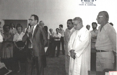Foto de 1982, da inauguração da nova agência do Banco do Brasil, onde ainda funciona a agência 1 do Banco do Brasil. Antes desta data, o Banco do Brasil era no prédio da Caixa Econômica Federal. (1) Devail Chiconeli – que trabalhava na superintendência do banco em São Paulo, (2) Padre Ângelo D’ Lara, (3) Carmindo Costa, gerente, (4) Elda Ataíde de Souza,