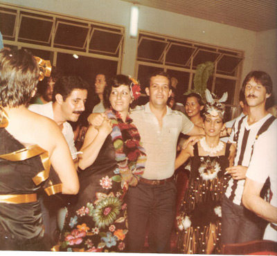 Foto de 1985, do Carnaval da Associação Atlética Ituveravense. (1) e (2) Guilherme Sinhorini Chaibub e Christiane Jorge Barbosa Chaibub. (2) e (3) Rafael Ferreira da Silva e Simone Sinhorini Chaibub da Silva, (4) Humberto Sinhorini Chaibub, (5) Auguato Sinhorini Chaebub (“Bill”), (6) e (7) José Antônio Jabur (Dodô) e Ana Maria Ribeiro Tanajura Jabur