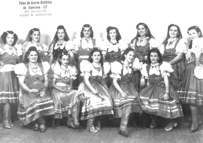 Foto da década de 40,do bloco carnavalesco “As Espanholas”. (1) Aparecida de Matos Spirlandelli (“Dica”), (2) Araci Mattar, (3) Lídia Marsaioli de Freitas, (4) Vanda Mattar Montagnini, (5) Lurdes Nielsen, (6) Geny Bandiera Marsaioli, (7) Angelina Bandiera Leite, (8) Yvone Cordaro. Sentadas: (9) Nair Corona Falleiros, (10) Luzia Lanna de Mattos, (11) Alice Menezes Mirândola, (12) Natalina Bandiera Amêndola, (13) Nina Menezes França