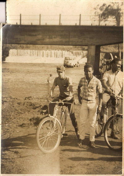 Foto de 1969, na Cachoeira Salto Belo. (1) Sebastião Vicente Coelho, proprietário da Vidraçaria Estrela, (2) e (3) os irmãos Pedrinho e Marcão, filhos do sr. Oto de Paula