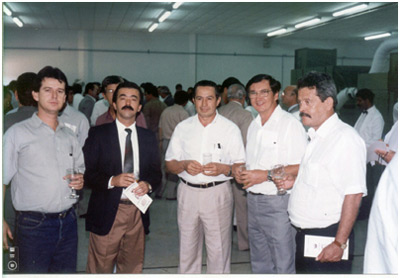Inauguração da fiação Salto Belo, do Grupo Maeda, em 9 de julho de 1991: (1) José Roberto de Freitas, subgerente do Banespa; (2) o vereador Antoninho Carlos Vieira de Matos;