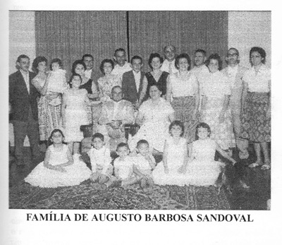 Sentados os patriarcas, o agropecuarista Augusto Sandoval e Maria Rita de Quadros Sandoval, o professor Antônio Roberto Sandoval e a esposa a professora Placedina Faleiros Sandoval (“Didi”), e os filhos Maria Rita Sandoval Mattar, Antônio Roberto Sandoval Filho e Maria Luiza Sandoval Figueiredo; Walter Sandoval e a esposa a professora Aparecida de Lima Sandoval e os filhos Mariza de Lima Sandoval Bernardo e José Augusto de Lima Sandoval; a professora Sinhá Sandoval Barbosa Lima, casada com o Dr. Antônio Barbosa Lima; a professora Anita Sandoval Ordine, casada como Dr. Cássio Garcia Ordine; Maria do Carmo Ferreira (“Fiúca”), a professora Maria Thereza Sandoval Beber, casada com o professor João Beber Filho; Augusto Barbosa Sandoval Filho, casado com a professora Neuza Stupelo Sandoval, e os filhos Maria Cândida Sandoval Ribeiro Barbosa (“Cacau”), Antônio Nelson Stupelo Sandoval e Maria Augusta Sandoval Ravagnani (“Guta”)