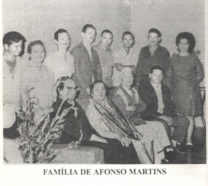 Família Martins. (1) e (2) Os patriarcas Afonso Martins e Ernestina Bueno de Morais Martins (“Dona Nhazinha”), e os filhos: (3) Wilson Martins, casado com Rute Zema Martins (ambos falecidos), (4) Willian Martins (“Lilo”), casado com Silvéria Menezes Martins (“Dona China”) (ambos falecidos), (5) Antônio Martins (in memoriam), (6) Nair de Lourdes Martins; (7) Wilton Martins (“Nequinha”) (in memoriam), casado com Nair Lopes Martins; (8) Willis Martins (“Nenzo”) (in memoriam), casado com Terezinha Margarida Pinto Martins; (9) Afonso Martins Filho (in memoriam), (10) Walter Martins (in memoriam); (12) Maria Lázara Martins Dias (“Lala”), casada com Durval Dias de Oliveira (in memoriam). O número 11 é um amigo da família que não foi identificado.