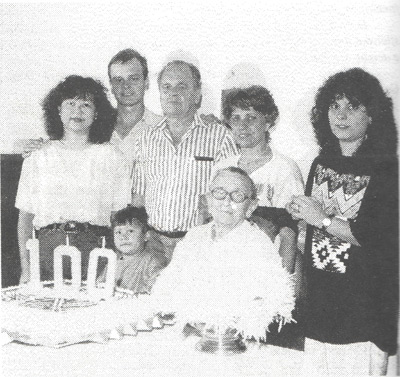 A matriarca da Família França, (1) Catharina Bombig França (“Dona Rina” em festa em que completou 100 anos. O filho (2) e (3) Rubens França e a nora, professora Maria José Athayde de Souza França, os netos (4) e (5) Rômel Athayde França e a esposa Cláudia Nakano França, (6) Regina Maria Athayde França, (7) e o bisneto Gustavo