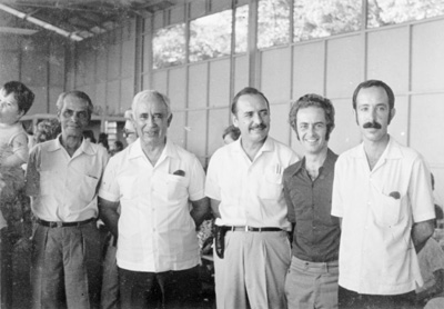 Foto de 1.969, nas dependências da empresa Camargo Corrêa, que eram instaladas na Via Anhanguera (próximas onde hoje é o pedágio). A Camargo Corrêa fazia todo o novo traçado da estrada de ferro desde Campinas, passando por Ituverava. (1) o jornalista Adhemar Cassiano, editor da Tribuna de Ituverava; (2) o agropecuarista Paulo Borges de Oliveira, (3) o prefeito Archibaldo Moreira Coimbra, (4) e (5) diretores da Camargo Corrêa e da Construtora Mendes Júnior