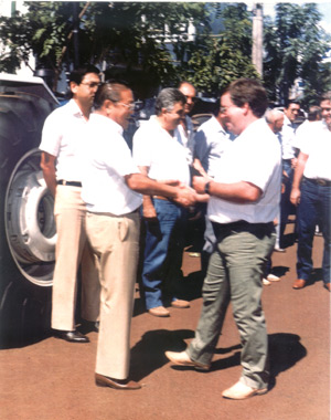 Foto de 1989, da solenidade de entrega de um trator zero quilômetro doado pelas famílias Maeda e Rodrigues (“Busa”), à Fundação Educacional de Ituverava, cujo presidente era o bancário aposentado Leonardo Lorecchio Netto. (1) Takayuki Maeda, representando a família Maeda; (2) Álvaro Carlos Rodrigues, representando a família Rodrigues;
