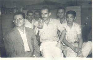 Foto de abril de 1959 do Iara Bar, do chef David Pedro, instalado onde hoje funciona a loja Stok Modas. (1) José Amadeu, que foi proprietário de um bar no largo da antiga Praça Rui Barbosa, hoje Praça Hélvio Nunes da Silva; (2) Antônio Soares, que era gerente da loja de eletrodomésticos da Radiolux; (3) Kenji Shimizu, técnico em eletroeletrônica da Radiolux; (4) o proprietário David Pedro e seu irmão, (5) Vildo Pedro; (6) Joaquim “Quico” França, proprietário da Livraria Cidade de Ituverava, onde hoje fica a Loja Ideal