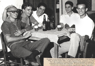 Em foto de 1965, os amigos (1) José Estevam Alves, (2) Luiz Falleiros Nunes da Silva, (3) e (4) os irmãos José Dirceu Cardoso Telles e Carlos Cardoso Telles, e (5) João Augusto Rodrigues, comemoravam do Pilec ‘s Bar, instalado na Galeria do Caiçara Hotel, hoje Dommus Hotel, o ingresso de José Estevam Alves (“Estevinho”) no curso de medicina. Ele, Luizinho Falleiros, e os irmãos José Dirceu e Carlinhos são médicos, e João Augusto é advogado.
