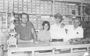 Foto da década de 60, na Casas Palmital, loja de calçados e chapéus que era instalada ao lado da Casa do Escritório, na Avenida Dr. Soares de Oliveira, em frente ao monumento à Bandeira Nacional. (1) Jorge Mauad Neto (“Abobrão”), (2) Iza Dias Gambi, (3) José de Paula Neto e (4) o proprietário da Loja, Elias Mauad (“Lita”)
