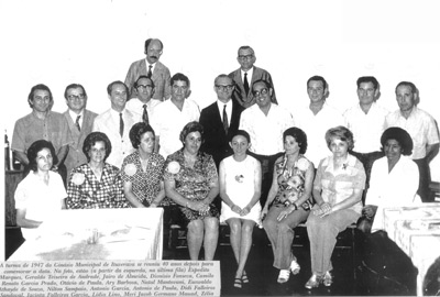 Festa da turma de 1947, do Ginásio Municipal de Ituverava, que se reuniu em 1987, para comemorar os 40 anos de formatura. (1) Expedito Marques, (2) Generaldo Teixeira de Andrade, (3) Jairo Ferreira de Almeida, (4) Dionísio Fonseca Sobrinho, (5) Camilo Renato Garcia Prado, (6) Otávio de Paula, (7) Ary Barbosa, (8) o professor Natal Mantovani, (9) Euswaldo Athayde de Souza, (10) Nilton Sampaio, (11) Antonio Garcia, (12) Antonio de Paula, (13) Placedina de Freitas Faleiros Sandoval (“Didi”), (14) Jacinta Falleiros Garcia, (15) Lídia Lino, (16) Meri Jacob Germano Mauad, (17) neta do professor Natal Mantovani, (18) Zélia Nunes Rego, (19) Gilda Nunes Marques de Lima e (20) Almerinda Lopes Corrêa