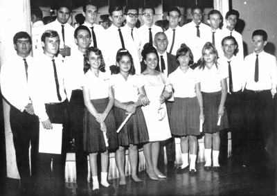 Formatura dos alunos da turma de 1966, da Escola do Comércio, em solenidade realizada na Associação Atlética Ituveravense: (1) Ivan Cardoso, (2) José Benedito Galdiano, (3) Joaquim Rodrigues da Rocha Neto, (4) Sérgio Corona, (5) Zevair de Menezes, (6) Augusto César Ferreira (“Diguidim”), (7) Paulo Benedito Generoso,