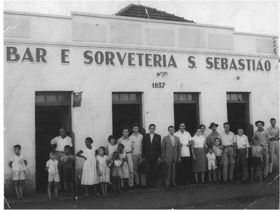 Foto de 1955, da Sorveteria São Sebastião, de propriedade de Despertino Gonçales, que era instalada à Rua Benjamin Constant, 1037, onde hoje funciona o bar e mercearia de propriedade de Jorge Galdiano. (1) e (2) Despertino Gonzales e sua esposa, Maria Galdiano Gonzales, (3) não identificado, (4) e (5) Wagner Gonzales e Valdir Gonzales, filhos de Despertino e dona Maria, (6) Roberto (falecido), (7) Luiz Galdiano (falecido), (8) Darci Gonzalez, (9) Valter Galdiano Gonzales, filho dos proprietários, (10) não identificado, (11) Cecílio Galdiano, (12) não idenficado, (13) Florentino Gonzalez, corretor de seguros, (14) não idenficado, (15) Isaac Gonçales (“Primo Barbeiro”), (16) Aparecida, (17) Dr. Benedito (“Tidico”), (19, 20 e 22) desconhecidos, (23) Manolo Gonzalez e (24) João Leite