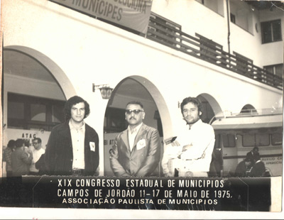 Foto do XIX Congresso Estadual dos Municípios, realizado de 11 a 17 de maio de 1975, na cidade de Campos do Jordão. Os vereadores (1) Cléso Barbosa da Silva, (2) o professor José Franco Rodrigues e (3) Sílvio Rafael Barbosa, todos falecidos