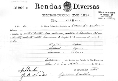 Foto de 1914, do Livro de Caixa da Coletoria de Rendas do Estado. O Coletor era José Barbosa Nunes e o escrivão Cypriano Coelho. O valor era 132$000 (centro e trinta e dois mil reis), recebidos do contribuinte Crhystino Ribeiro dos Santos