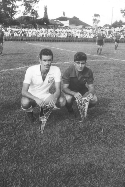 Foto dos anos 60, quando o time misto do Santos Futebol Clube jogou amistosamente em Ituverava, contra a equipe da Associação Atlética Ituveravense, o Tigre do Ramal. (1) O lateral-direito Getúlio, (2) Celso Nunes da Silva (“Piolim”) que também jogava de lateral-direito. Os dois eram grandes craques