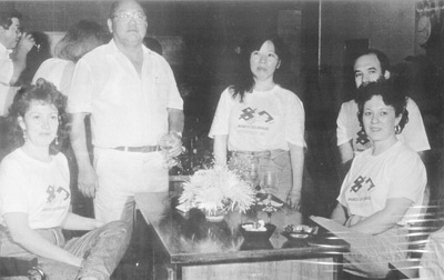 Foto de 1991 , Foto das festividades dos 50 anos da agência do Banco do Brasil de Ituverava. (1) o comendador Takayuki Maeda, que era presidente do Grupo Maeda, era recepcionado pelas funcionárias: (2) Regina Lúcia dos Santos Bernardes, (3) Mary Toyoda, (4) Maria Sueli Correa Mariano Bucker, (5) Sebastião Pereira de Souza.