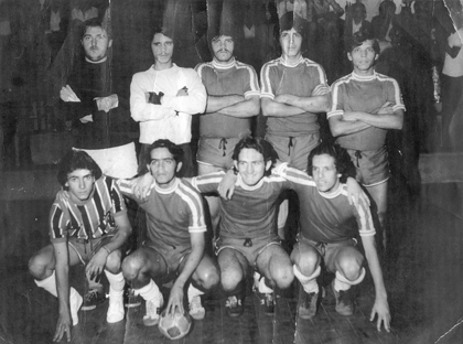Equipe de futebol de salão São Francisco, que foi campeão em 1974, na inauguração do Ginásio de Esportes. (1) Marcos Veronez, (2) Antonio de Pádua Alves Ferreira (Pitu), (3) Luiz Cláudio Tótoli, (4) Carlos Roberto Pedroso (Beto), (5) Antonio Carlos da Silva Neves (Feceo), (6) Marco Antonio Alves Fontoura (Biraka), (7) Paulo Roberto Alves Ferreira (PC), (8) Célio Rizieri, (9) Rafael Ferreira da Silva