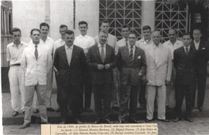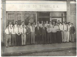 Foto de 14 de junho de 1966, dos funcionários na frente do Banco do Brasil, quando a agência ainda funcionava na Avenida Dr. Soares de Oliveira, 366, onde hoje é a Caixa Econômica Federal. (1) Orlando Garcia do Nascimento, (2) Paulo Edson Valim, (3) Valter Expedito Segantini, (4) Yoshimite Arima, (5) Pedro Cristhino Barbosa, (6) Herlei Silva Prazeres, (7) Sérgio Gonçalves Costa, (8) José Amaro Vieira Coelho, (9) Leonardo Lorecchio Neto, (10) Walquírio Urbano Corsino, (11) Fábio Lacerda Diniz, (12) Roberto Marques de Oliveira, (13) Devayl Antônio Ciconeli, (14) Diógenes Gomes Curado, (15) Eurípedes Barsanulfo da Fonseca, (16) Adolfo Medina Bucker, (17) Ayres Carlos de Menezes, (18) Eri Rodrigues Aveiro, (19) Mozart Martins de Resende, (20) Jonathas Lopes Filho, (21) Ruy Delfino Diniz, (22) Benedicto Alves Mafei, (23) Waldir Martiniano de Oliveira (gerente), (24) Ruy Carvalho (inspetor), (25) Ione Correa, que era subgerente, (26) Vitório Restivo, (27) José Olavo de Freitas, (28) Evaldo Botta e (29) Plínio Mestriner