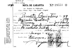 Nota de Garantia emitida para Benedito Quintino, pela Sociedade Paulista de Publicação, para aquisição da assinatura anual da coleção “Conselheiro Médico”, no valor de CR$ 350,00 para 12 meses. O documento nº 19553 é de março de 1952.