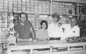 Foto da década de 60, na Casas Palmital, loja de calçados e chapéus que era instalada onde é a Casa do Escritório, na Avenida Dr. Soares de Oliveira, em frente ao monumento à Bandeira Nacional. (1) Jorge Mauad Neto (“Abobrão”), (2) Iza Dias Gambi, (3) José de Paula Neto, (4) o proprietário da Loja, Elias Mauad (“Lita”).