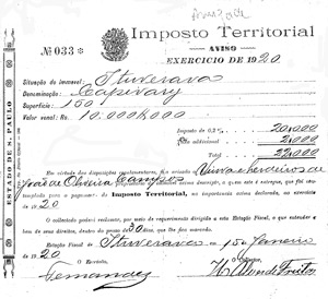 Recibo datado de 15 de janeiro de 1920, do pagamento do Imposto Territorial, Guia