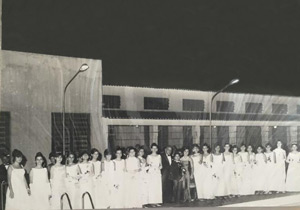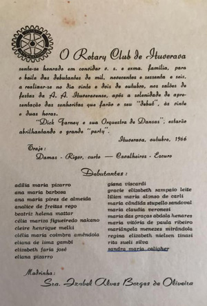 Convite para o Baile de Debutantes de 1966, realizado na Associação Atlética Ituveravense. A madrinha foi Isabel Alves Borges de Oliveira, esposa do Dr. Paulo Borges de Oliveira. O evento foi abrilhantado por Dick Farney e sua Orquestra de Danças, que era uma das mais consagradas da época. Na foto abaixo tirada na piscina do clube, as vinte e três debutes e a madrinha. Na terceira foto as debutantes. (1) Sandra Maria Caligher, com o pai Amadeu Caligher, (2) Rita Sueli Silva e o pai José Luiz da Silva e (3) Regina Elizabeth Nielsen Tinasi com o pai Osvaldo Tinasi.