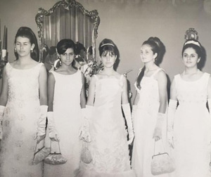 Foto do Baile de Debutantes de 1966, realizado na Associação Atlética Ituveravense. A madrinha foi Isabel Alves Borges de Oliveira, esposa do Dr. Paulo Borges de Oliveira. O evento foi abrilhantado por Dick Farney e sua Orquestra de Danças, que era uma das mais consagradas da época. (1) Regina Elizabeth Nilsen Tinasi, (2) Elizabeth Faria José, (3) Rita Sueli da Silva, (4) não identificada e (5) Sandra Maria Caligher