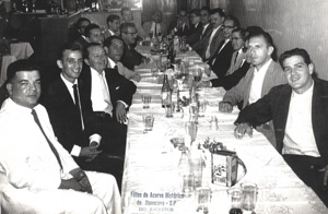 Festa de funcionários de Banco do Brasil 1958, na despedida do Inspetor Nelson Gaia Penteado, que foi subgerente em Ituverava. (1) Ruy Delfino Diniz, (2) Jonathas Lopes, (3) Vitório Restivo, (4) Diogenes Gomes Curado, (5) José Amaro Vieira Coelho, (6) João Elízio de Carvalho, (7), (8) Adolfo Medina Bucher, (9) Devayl Antonio Chiconelli,