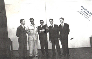 Na foto dos anos 50, no palco do auditório da Rádio Cultura de Ituverava, os radialistas (1) João Beber Filho, (2) Luiz Amendola, (3) Túlio Del Guerra, (4) Sílvio Correia Gomes e (5) Gilton Morgan de Aguiar