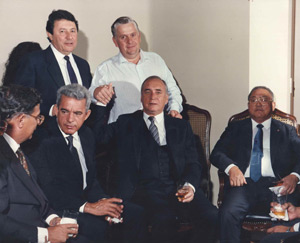 Foto de homens que fazem parte da história de Ituverava. Em julho de 1992, quando o então o ministro da Agricultura, Iris Rezende Machado, foi paraninfo da primeira turma de formandos do curso de Agronomia da Facultada Dr. Francisco Meda, entidade mantida pela Fundação Educacional de Ituverava. Ele foi recebido pelo comendador Takayuki Meda, em sua residência. (1) o comendador Cley Jorge de Oliveira (in memoram), (2) o empresário Luiz Carlos Rodrigues (“Busa”), (3) o médico e ex-prefeito Dr. Ecyr Alves Ferreira, recentemente falecido, (4) o então ministro da Agricultura, Iris Rezende Machado, hoje prefeito de Goiânia, (5) o médico e ex-prefeito, Dr. Archibaldo Moreira Coimbra (in memoriam), (6) o anfitrião comendador Takayuki Meda (in memoriam)