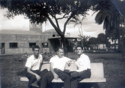 Em 1957, sentados em um banco da Praça 10 de Março, os amigos, (1) Guido Del Guerra, que era relojoeiro, (2) Luís Orlando Soares de Oliveira, professor, que faleceu em 1988, e o bancário aposentado Leonardo Lorechio. Ao fundo, o prédio da rodoviária que estava em construção, onde hoje é a praça de alimentação, na Praça 10 de Março.