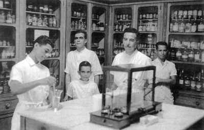 Foto de 1960, da Farmácia Santo Antônio, que era instalada na rua Cel. José Nunes da Silva, onde hoje é a Associação Comercial e Industrial de Ituverava. A foto foi tirada no laboratório da farmácia, onde a maioria dos remédios eram manipulados. (1) O proprietário, Francisco Alves Ferreira (“Chiquinho da Farmácia”), (2) Nelson Cordaro, que acompanhou toda a trajetória da farmácia, até que passou a se denominar Itudrogas e Pharma In, onde trabalhou por vários anos, 3) Antônio Carlos de Oliveira, (4) o garoto não foi identificado e (5) Gersino Pistori