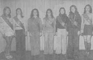 Foto de julho de 1973, das jovens participantes do concurso “Rainha da Amizade”, que foi organizado por senhoras ligadas ao Rotary Club de Ituverava, na gestão do então presidente Hermes Procópio dos Santos. A rainha eleita foi Cristiane Guerreiro, representando a empresa Camargo Corrêa. (1) Tomy Kikuda, representando o Banco do Brasil, (2) Regina Nader – Olinda Administração e Representações Ltda., (3) Liane Batista – Banco Real, (4) a rainha Cristiane Guerreiro, (5) Solange do Vale de Almeida – Oimasa, (6) Rita de Cássia Paulino Coelho – Nutriagro, (7) Vera Gonçalves – Ituverauto Veículos e Matel Mecanização Agrícola