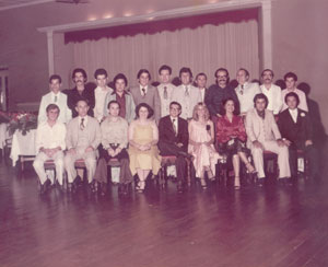 Recepção em homenagem ao sr. Benedito de Mattos por ocasião de sua aposentadoria como gerente da agência de Ituverava do Banco do Commércio e Indústria de São Paulo S/A (Comind). A solenidade foi realizada em 1978, no salão de festas da Associação Atlética Ituveravense. (1) Hélio Pereira Vaz, (2) Altair da Silva, (3) Milson Luís Liporaci, (4) Antônio Carlos de Paula, (5) Laércio Fogaça de Souza, (6) Sebastião Celso de Oliveira, (7) Valter da Silva Sampaio, (8) José Paulo Barbosa, (9) Jerônimo Moreira da Silva, (10) Aguiar Athayde de Souza, (11) Wilson Antônio Matos Alves, (12) Carlos Fontebaci. Sentados: (13) Aparecido Fátimo Bento, (14) Accácio Antônio Borghini, (15) Sebastião Ferreira Barbosa, (16) Neusa Maria Graner, (17) o gerente Benedito de Mattos que foi homenageado, (18) Dilma Ribeiro Rocha, (19) Maria Isabel Alves,