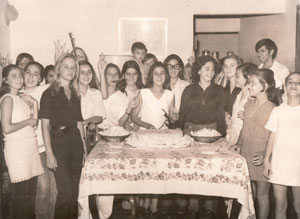 Foto do ano de 1971, do aniversário de 15 anos de Cleuza Mariano Viaro, na residência de seus pais Arcênio Viaro e Edna Mariano Viaro. (1) Vera Nader, (2) Denise Jardim, (3) Nélia Santiago Pontes, (4) América de Menezes, (5) Solange Bavaresco, (6) Lígia Rodrigues Tosta, (7) Maria Elídia Carrer, (8) Elaine Bavaresco, (9) Antonieta Dalmázio Cristóvão, (10) Maria Inês, (11) a aniversariante Cleuza Viaro, (12) Edna Barbosa de Mattos, (13) a mãe da aniversariante Edna Viaro, (14) Margarette Germano Del Guerra, (15) Leila Viaro, irmã da aniversariante, (16) Vera Sakemi, (17) Carlos Jacob Daur, (18) Mariza Carrer e (19) Heloísa Caliguer.