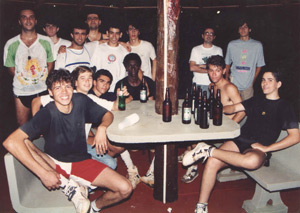 Foto dos anos 90/91, no quiosque da sauna da Associação Atlética Ituveravense, de amigos que jogavam futebol de salão da quadra externa do clube. (1) Fernando Caetano de Souza (“Vareta”), (2) Marcelo Betini Pires, (3) Serginho Sandoval, (4) Fernando Nicomedes (“Chicocão”), (5) Vicente Duzi Garcia, (6) Guilherme Abdala (“Bidi”),
