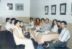 Foto de confraternização da Escola de Idiomas CCAA, realizada em 1995, no antigo restaurante Varandão. (1 e 2) os proprietários Amauri Faria de Oliveira e Maria Amélia Rodrigues de Oliveira; (3) Cláudia Maeda; (4) Sara Jorge; (5) Karla Mara Alves Freitas; (6) Adriana Antunes; (7) Amauri Faria de Oliveira Filho; (8) Delfina Sanae Maeda Matsubara, (9) Neusa Galindo; (10 e 11) Mauro Ribeiro Bueno e esposa Joana Possa Bueno.