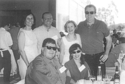 Foto de 1.996, no Ituverava Tênis Clube de uma festa de confraternização de amigos da geração dos anos 50 e 60. (1) e (2) os irmãos Rosa Maria Alves e o médico Estevão José Alves, (4) Maria Aparecida Barbosa (“Piscida”), (5) Fernando Nogueira, (6) e (7) José Roberto de Oliveira Menezes (“Bodeis”)