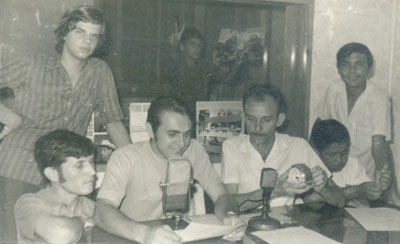 Em agosto de 1970, foto no estúdio da Rádio Cultura de Ituverava. (1) Carlos Alberto Amêndola, (2) Luiz Fernando Henrique dos Santos, (3) Benedito Galdiano, (4) José Valizi e (5) Benclei Costa Vasconcelos.