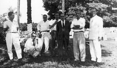Foto dos anos 60, de rotarianos plantando árvore na Praça 10 de Março. (1) o agropecuarista Eurípedes Ribeiro (Pino), (2) o professor José Ferreira de Assis (in memoriam), (3) o jornalista Muchir Miguel Francisco (in memoriam), (4) o cartorário Luiz Amendola (in memoriam), (5) o advogado Halley Henares (in memoriam), (6) o vereador José Antônio Salgado (in memoriam) e (7) o empresário Arcênio Cadelca (in memoriam)