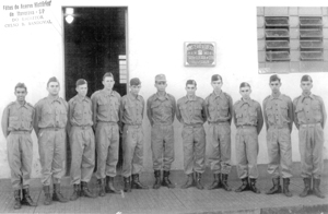 Turma de atiradores do ano de 1937, que prestou o Serviço Militar em 1956; (1) não identificado; (2) José Luiz Falleiros; (3) Milton Fernandes Bueno; (4) João Chavaglia Neto; (5) Nelson Santo Brunherotti; (6) o chefe de instrução do TG, capitão Washington de Souza Gomes; (7) Paulo Rodrigues dos Santos; (8) Sebastião Celso de Oliveira; (9) Marco Antônio Salgado; (10) Antônio Paulo Nascimento e (11) Eurípedes Carlos Figueiredo