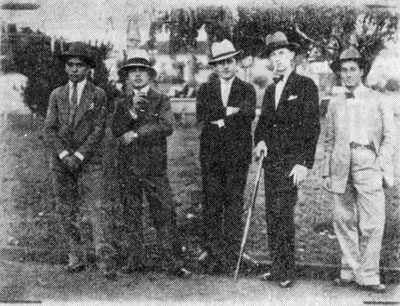 Foto de 1934, de um grupo de amigos na Praça 10 de Março, eles eram chamados de os “almofadinhas”, pois vestiam sempre na moda. (1) João Zaidan, (2) Debinho, (3) Miguel Jabur (“Bacherim”), (4) Moacir França e (5) Gabriel Justino de Figueiredo