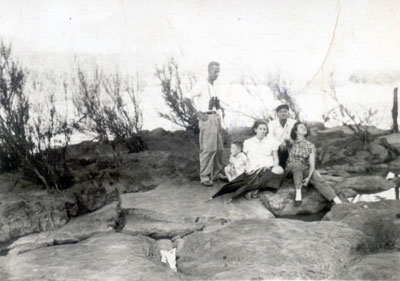 Foto de 1950, quando o Rio Grande foi desviado, e conseqüentemente ficou vazio, para a construção da Represa de Furnas, famílias aproveitaram para registrar o fato histórico, no leito do rio vazio. (1) e (2) Assad Chaibub e a esposa, Wany Sinhorini Chaibub, (3) o filho Augusto Sinhorini Chaibub (“Byll”), (4) Otelo Viaro e