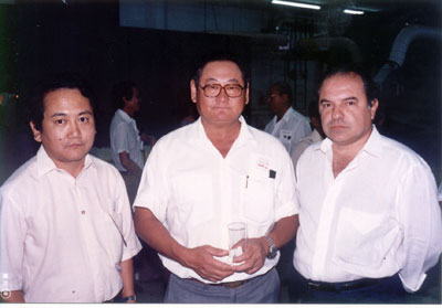 Prestigiaram a inauguração da Fiação Salto Belo, do Grupo Maeda, em 9 de julho de 1991, (1) o médico Mauro Shozo Shiratsuchi, que é Secretário da Saúde do Município, e os agropecuaristas (2) Kenyti Okano e (3) Antonio Sérgio de Quadros Barbosa